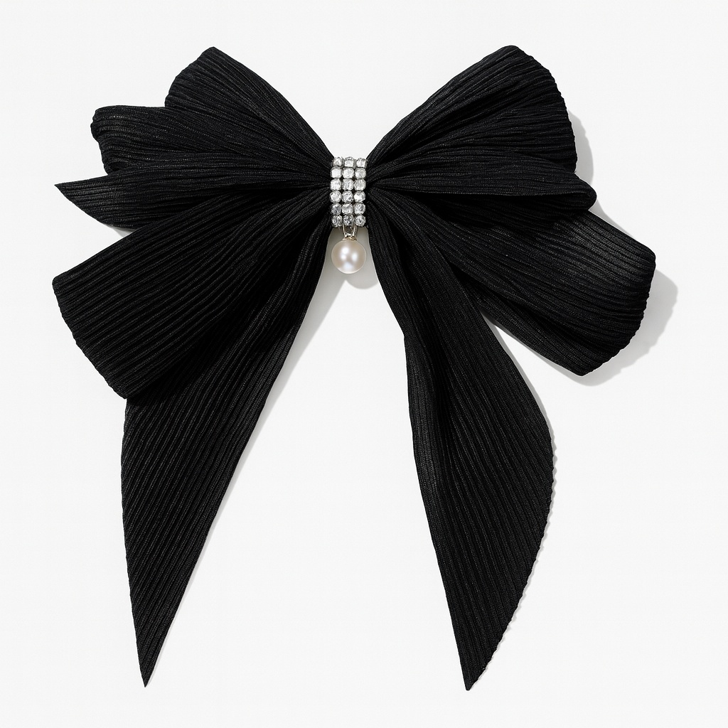 Стильный и утончённый бант для волос станет идеальным дополнением к любому образу. На фото представлен крупный чёрный аксессуар из лёгкой фактурной ткани, собранный в изящный бант. В центре он украшен декоративной вставкой с мелкими стразами и миниатюрной жемчужиной, которая придаёт изделию нотку роскоши и женственности.