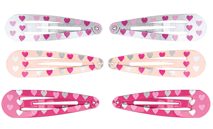 На фото представлены заколки в трех вариантах дизайна: серебристые с блестками, нежно-розовые и ярко-розовые, каждая украшена узором из разноцветных сердечек. Их лаконичная форма и милый принт делают аксессуар стильным акцентом для девочек и девушек. Такой набор станет отличным выбором для подарка или дополнения к модному луку.