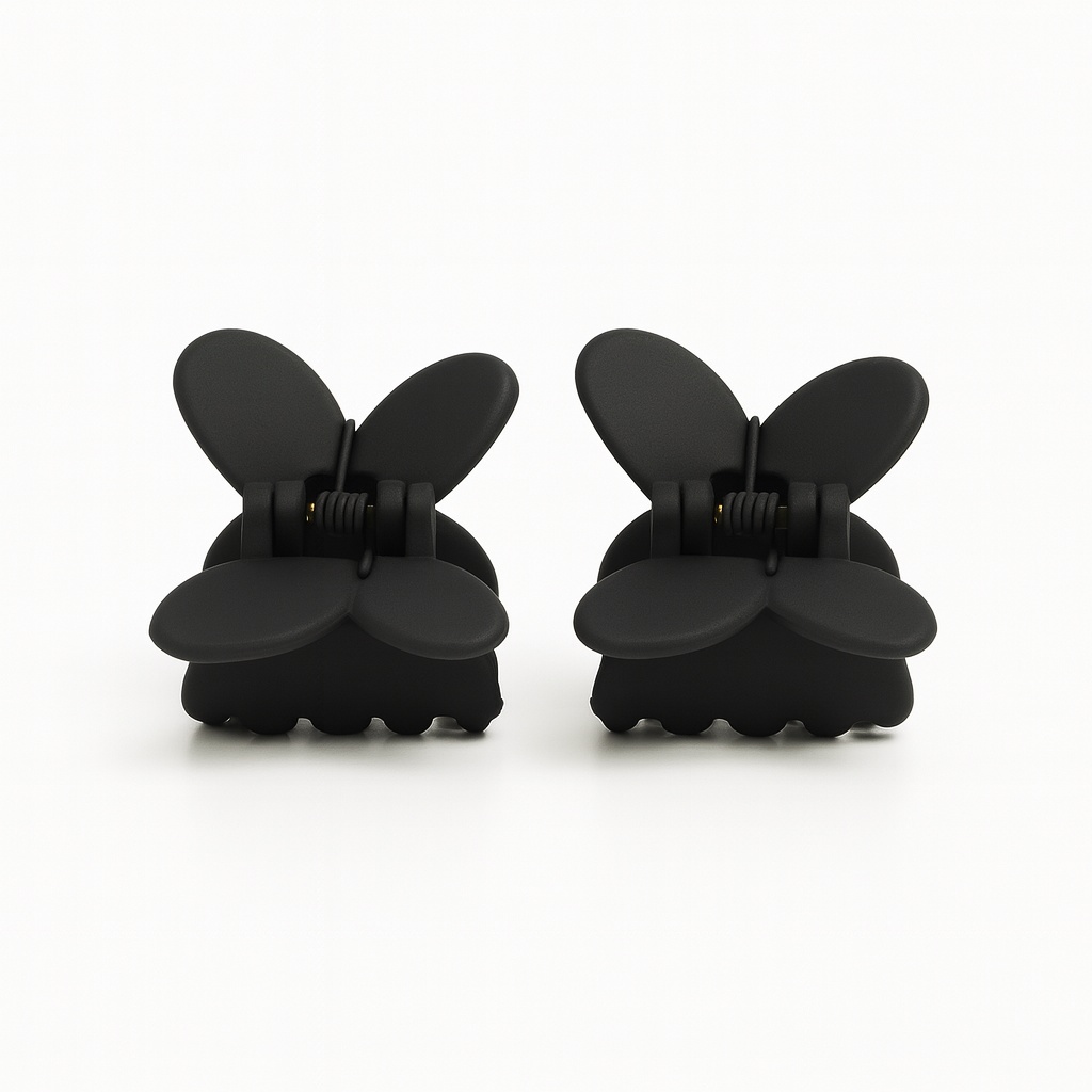 Компактные зажимы для волос в форме бабочек — стильное и удобное решение для повседневных причёсок. На фото представлены два зажима матового чёрного цвета с плавными очертаниями крыльев, которые придают образу лёгкость и изящество. Прочный металлический механизм с пружиной обеспечивает надёжную фиксацию, не повреждая волосы.