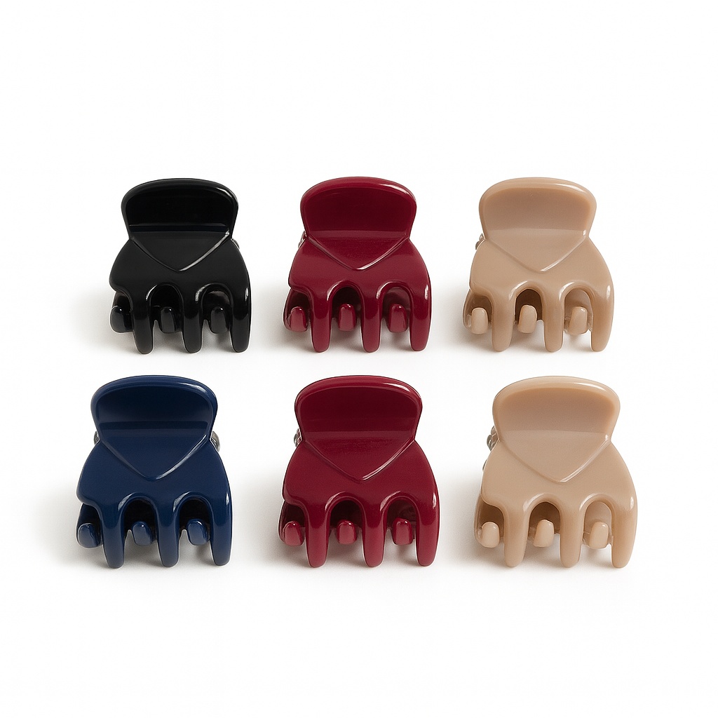 Компактные зажимы для волос — практичный набор для аккуратных причёсок и фиксации мелких прядей. На фото представлены мини-крабики в разных цветах: чёрный, бордовый, синий и бежевый. Каждый зажим имеет гладкую глянцевую поверхность и надёжный металлический механизм, обеспечивающий крепкую фиксацию без заломов.