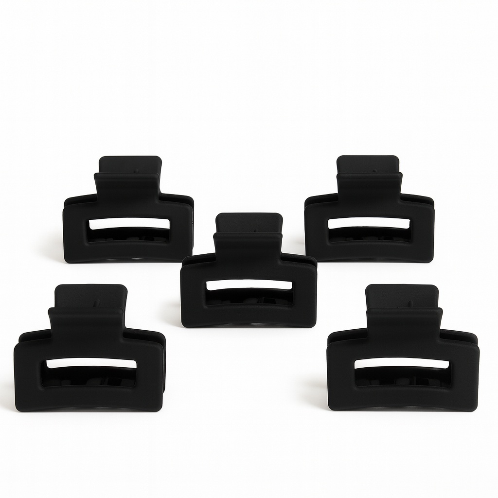 Набор компактных зажимов для волос — стильное решение для повседневных и аккуратных причёсок. На фото представлены пять зажимов матового чёрного цвета с лаконичным геометрическим дизайном. Их минималистичная форма делает аксессуар универсальным — подходит как для делового стиля, так и для повседневного образа.