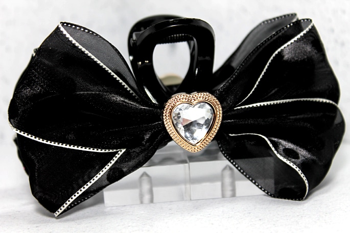 Эффектная заколка-краб с крупным бантом из лёгкой чёрной ткани и сверкающим кристаллом в форме сердца — идеальный выбор для тех, кто любит сочетать элегантность и женственность. На фото видно, как воздушный материал банта красиво переливается, а контур из белой окантовки подчёркивает аккуратную форму. В центре композиции — сердце в золотистой оправе, придающее аксессуару изысканный блеск.