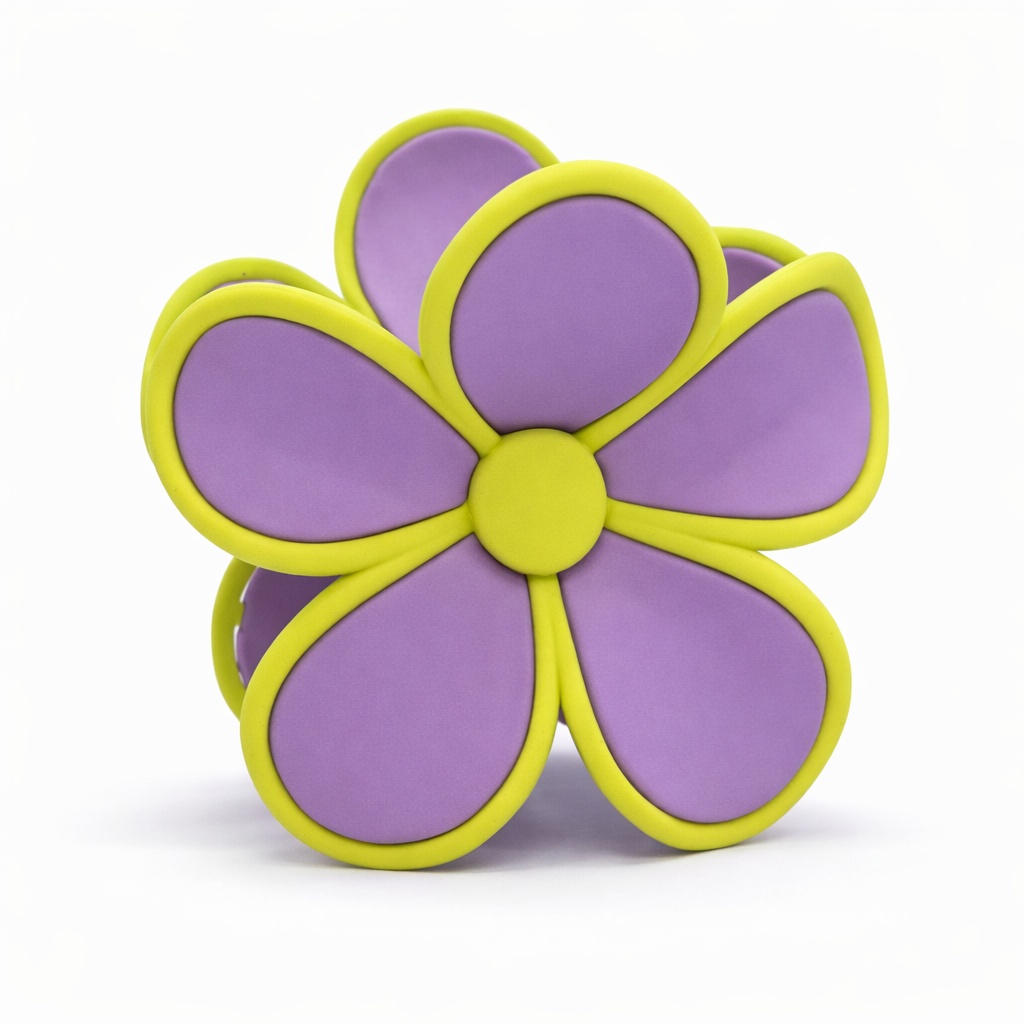 Стильная заколка-краб в форме цветка с сиреневыми лепестками и контрастной салатовой окантовкой — яркий аксессуар для создания модных и аккуратных причёсок. Матовая текстура и выразительное цветовое сочетание делают модель заметной деталью любого образа.