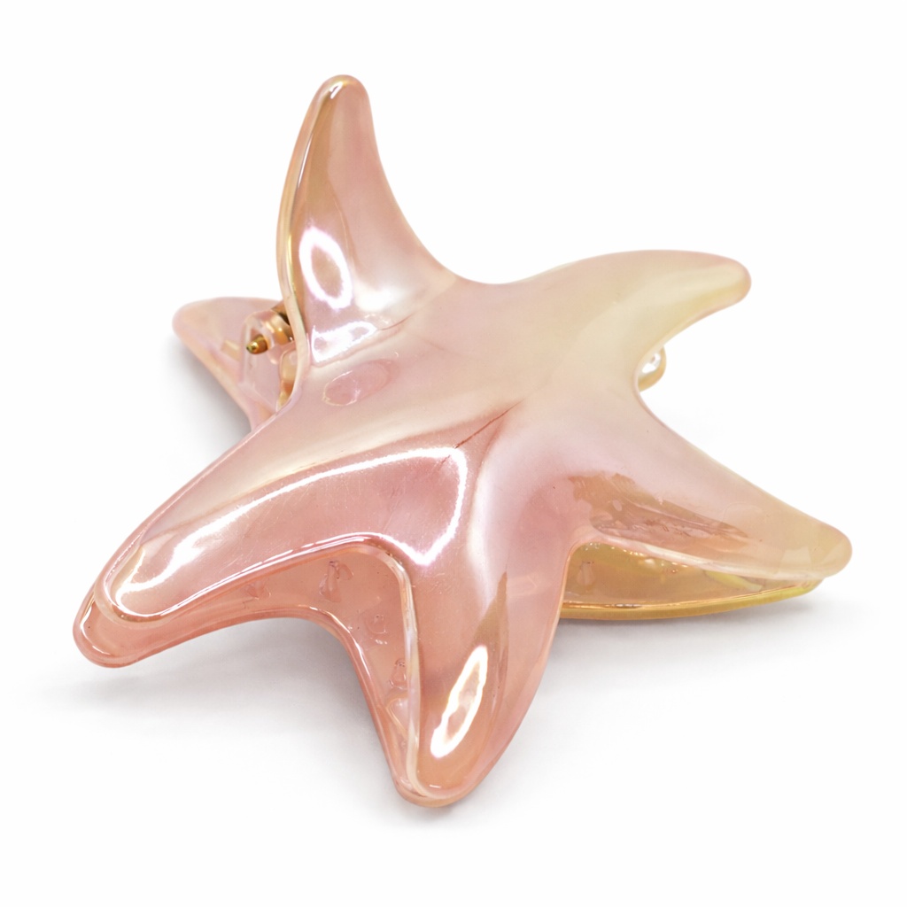 Оригинальная заколка-краб в форме морской звезды с нежным перламутровым переливом розовых и жёлтых оттенков — стильный акцент для летних и повседневных образов. Глянцевая поверхность красиво отражает свет и создаёт эффект мягкого сияния.