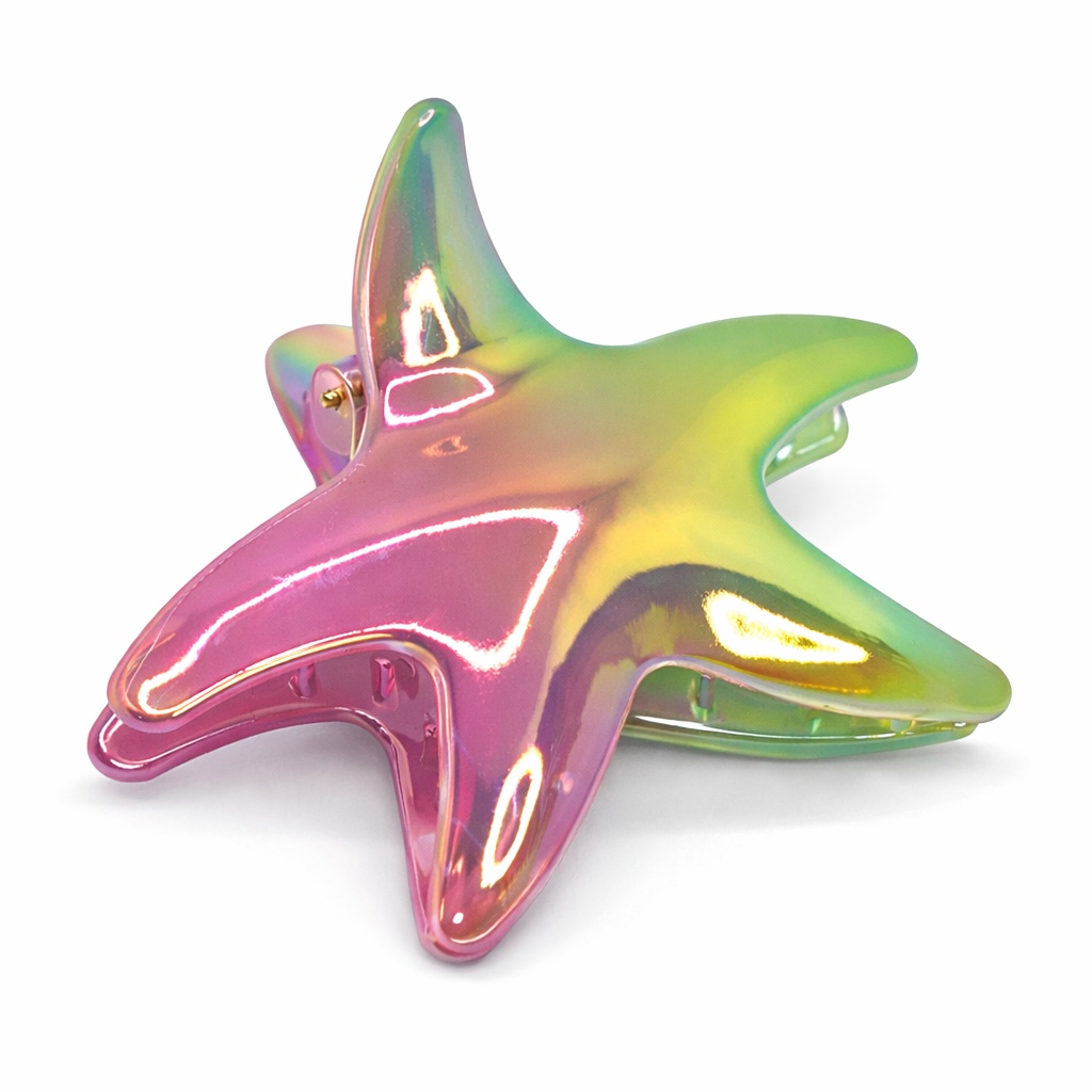 Яркая заколка-краб в форме морской звезды с эффектным перламутровым переливом розовых и зелёных оттенков — стильный аксессуар для смелых и модных образов. Глянцевая поверхность красиво играет на свету, создавая эффект радужного сияния.
