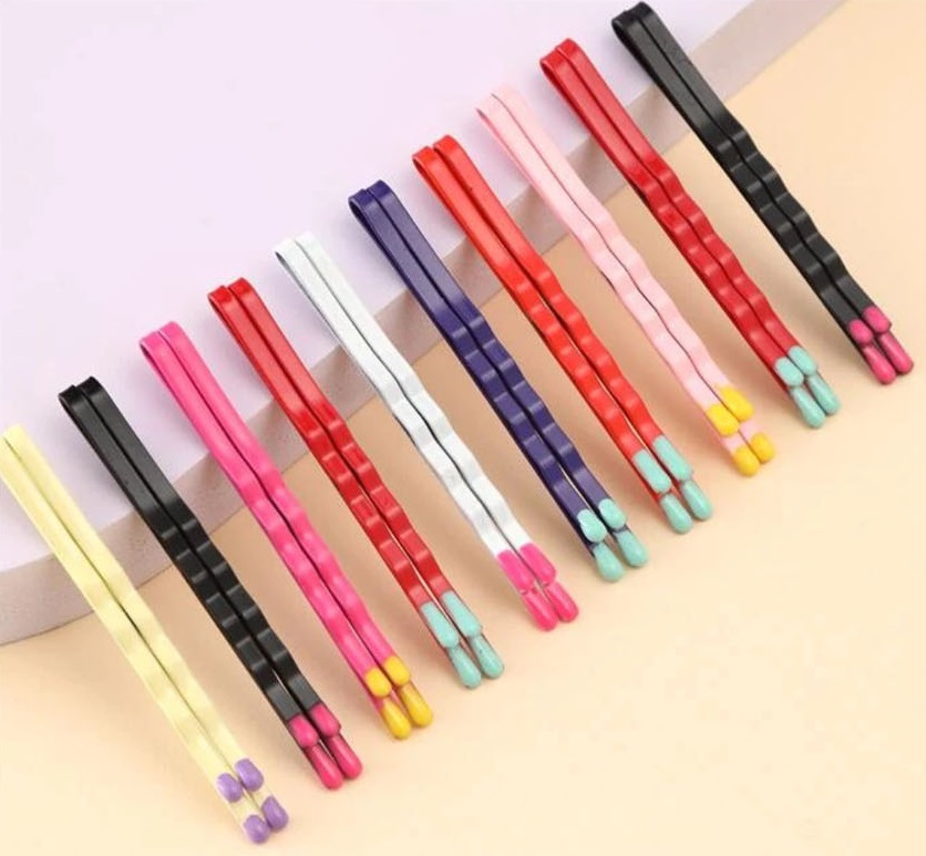 Яркие невидимки для волос — стильный и практичный аксессуар, который добавит красок в любой образ. На фото представлен набор шпилек в разных цветах: черный, красный, розовый, белый, фиолетовый и другие, каждая из которых украшена контрастными наконечниками — желтыми, сиреневыми, бирюзовыми или розовыми. Благодаря удобной форме они надежно фиксируют волосы, не повреждая их и не создавая дискомфорта. Этот набор станет отличным выбором как для повседневной укладки, так и для создания игривого акцента в прическе.