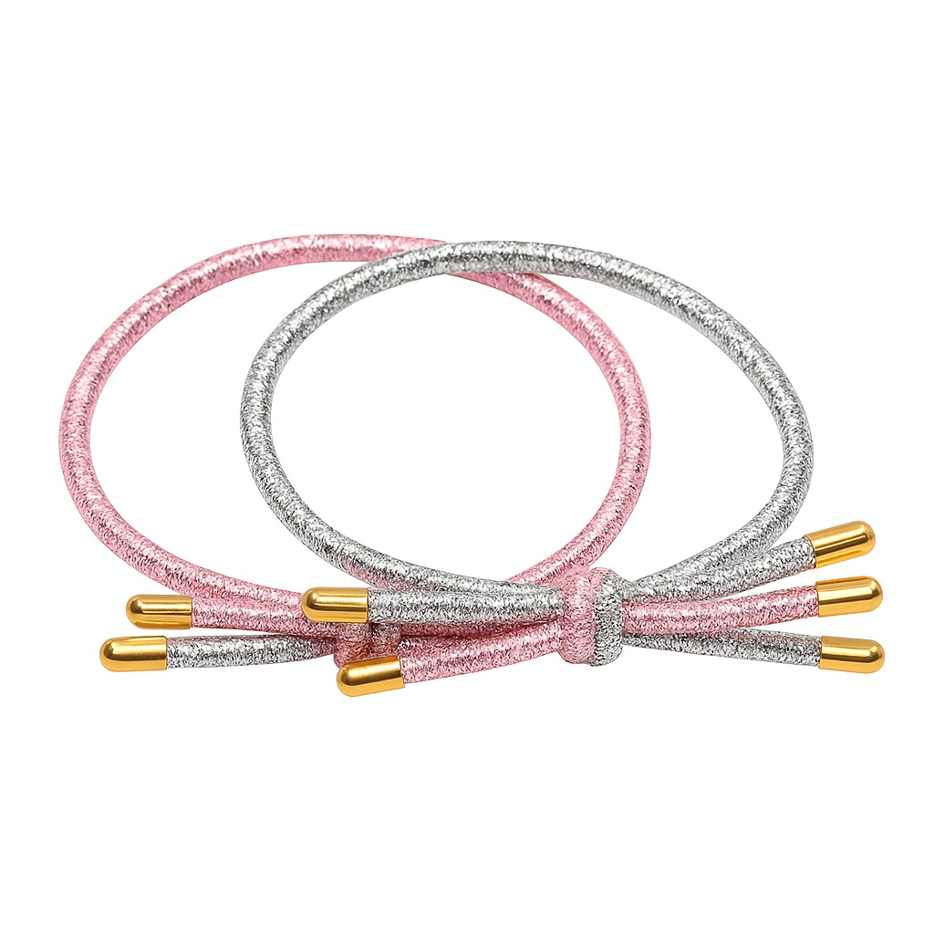 Элегантный набор резинок для волос сочетает в себе изысканный блеск и практичность. В комплект входят резинки двух оттенков — нежно-розовые и серебристые, украшенные металлическими золотыми наконечниками, которые придают аксессуарам изящный и современный вид. На фото видно, что каждая резинка выполнена из плотного эластичного материала с мерцающей нитью — они надёжно удерживают волосы, не путая и не повреждая их. Благодаря стильному дизайну такие резинки подойдут как для повседневных образов, так и для праздничных причёсок.