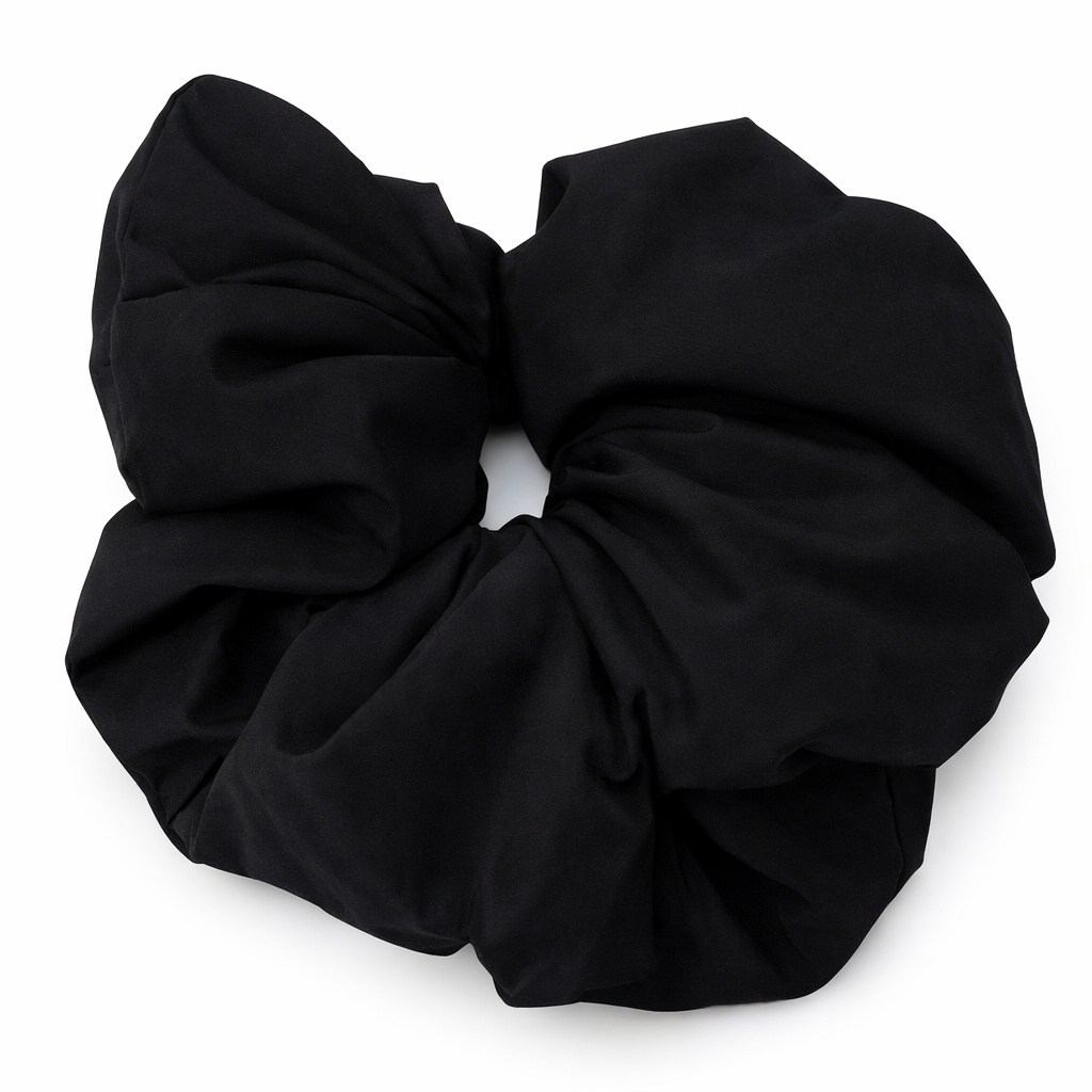 Стильная чёрная резинка-скранчи выполнена из мягкого, приятного на ощупь текстильного материала с матовой поверхностью. На фото заметна увеличенная объёмная форма с плотными складками, благодаря которой аксессуар выглядит эффектно и современно. Резинка надёжно фиксирует волосы, не тянет и не повреждает их, обеспечивая комфорт при носке в течение всего дня. Универсальный чёрный цвет делает её идеальным выбором для повседневных образов, спорта и минималистичных причёсок.