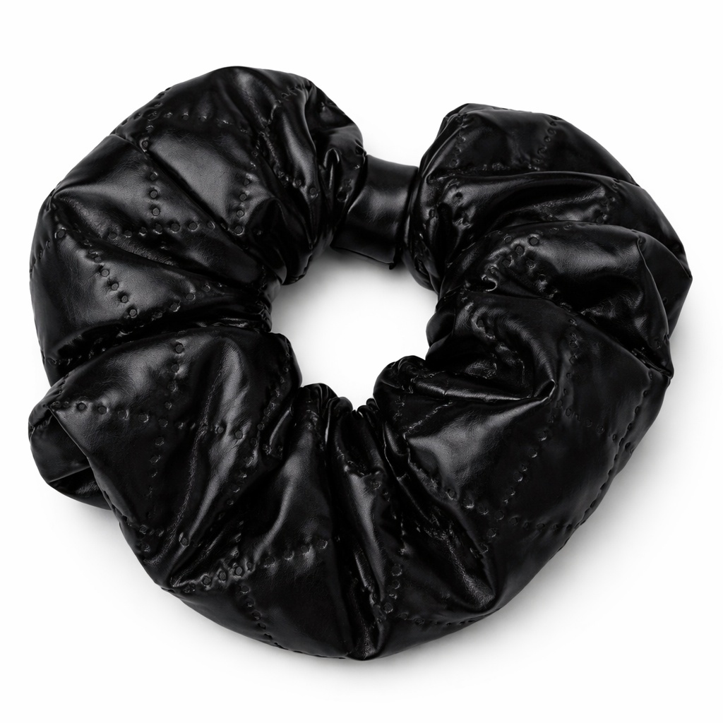 Стильная резинка-скранчи выполнена из мягкой экокожи насыщенного чёрного цвета с лёгким матовым блеском. На фото хорошо видна объёмная форма и аккуратный декор в виде мелких заклёпок, равномерно распределённых по всей поверхности, что придаёт аксессуару модный и выразительный характер. Резинка надёжно фиксирует волосы, не тянет и не повреждает их, оставаясь комфортной даже при длительном ношении. Идеально подойдёт для повседневных и вечерних образов, добавляя причёске стильный акцент и нотку современного шика.