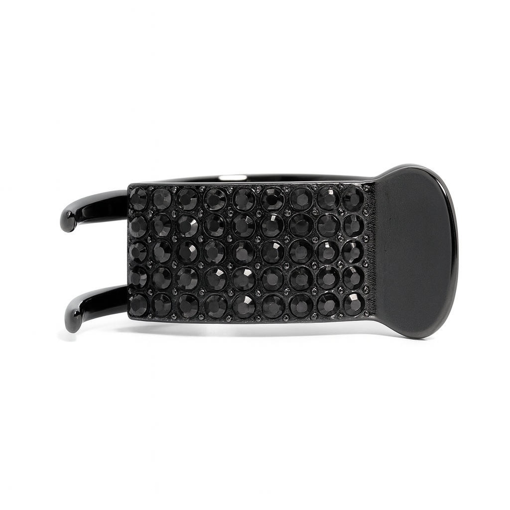Современное кольцо с черными кристаллами — это сочетание лаконичного дизайна и выразительного блеска. На фото видно: массивная металлическая основа с широкой поверхностью, полностью усыпанной мелкими стразами глубокого черного оттенка. Камни красиво переливаются при свете, создавая эффект легкого гламура и уверенности в деталях.