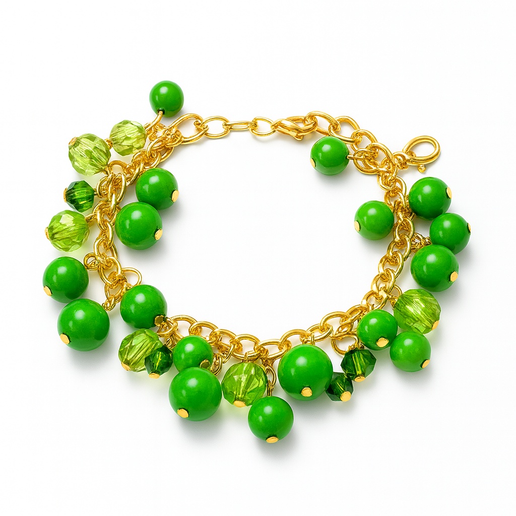 Яркий браслет с массивными золотыми цепочками и зелеными бусинами — идеальное украшение для стильных и смелых образов. Сочетание глубокого зеленого оттенка с блеском золота создает эффектное контрастное решение, которое сразу привлекает внимание. На фото видно, что бусины разных размеров гармонично чередуются, добавляя динамику и объем украшению. Такой браслет станет отличным акцентом как для повседневного наряда, так и для вечернего выхода.