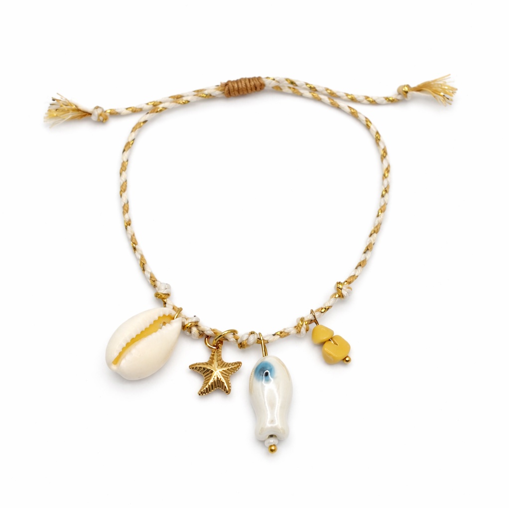 Браслет-нитка с морскими подвесками: ракушка, морская звезда и рыбка, бело-золотой цвет