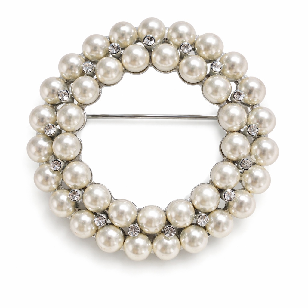 Элегантная брошь выполнена в форме круга и украшена крупными жемчужными бусинами кремового оттенка, гармонично дополненными сверкающими кристаллами. На фото видно аккуратную металлическую основу с классической булавкой, обеспечивающей надёжное крепление к одежде. Сочетание перламутрового блеска жемчуга и сияния кристаллов создаёт изысканный и нарядный образ. Аксессуар идеально подойдёт для украшения жакетов, пальто, платьев или шарфов, добавляя образу утончённости и женственности.