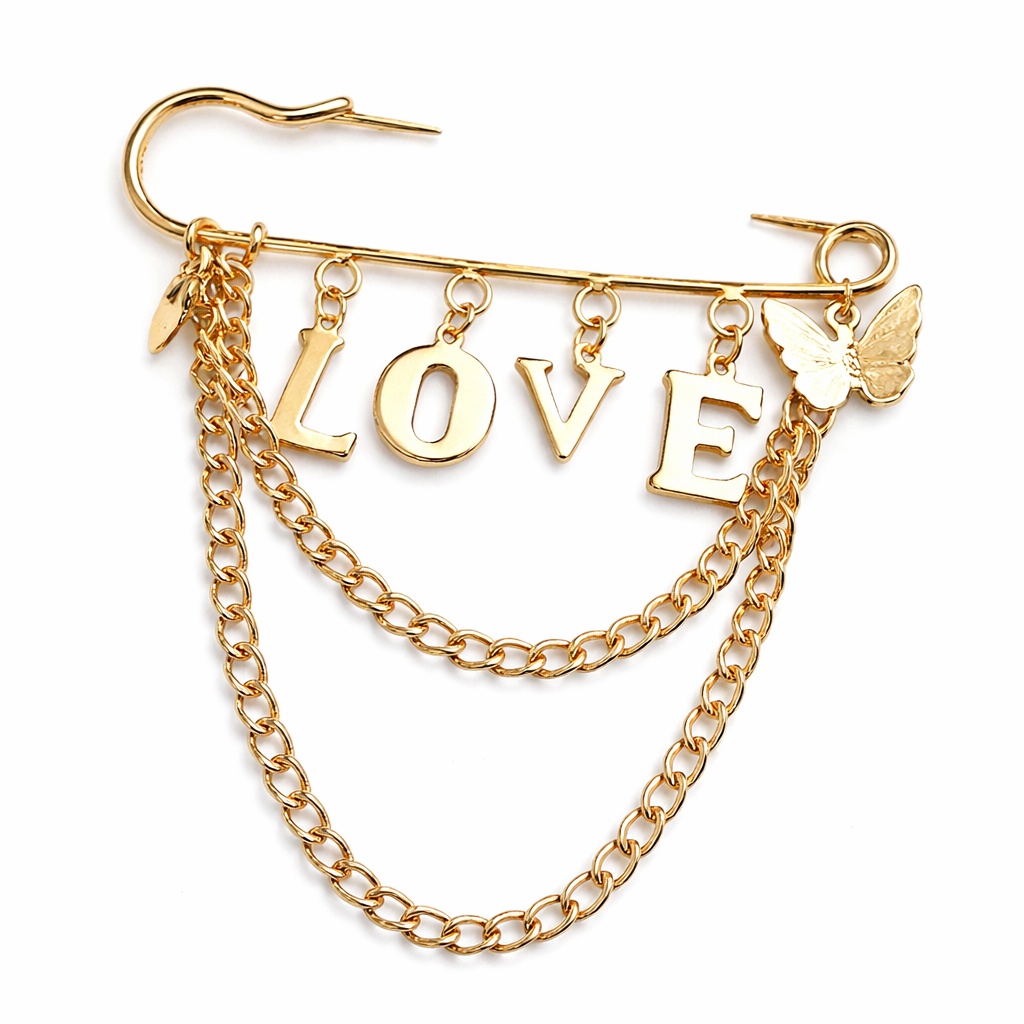 Эффектная брошь-булавка с подвесками в виде букв «LOVE» станет ярким акцентом в вашем образе. На фото видно изящную золотистую основу с двумя цепочками, которые красиво ниспадают и добавляют украшению лёгкой динамики и блеска.