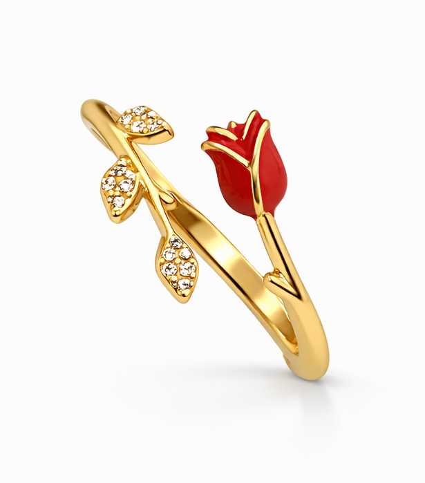 Нежное кольцо с декоративной розой — романтичный аксессуар, который подчеркнёт вашу женственность и утончённый вкус. Яркий красный бутон гармонично сочетается с золотистой основой и сверкающими кристаллами на листьях, создавая эффектный и запоминающийся образ.