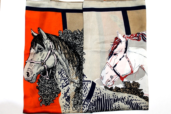 Эффектный платок с художественным изображением лошадей — яркий аксессуар, который добавляет образу индивидуальности и динамики. На фото видно выразительный принт в сочетании насыщенного оранжевого, спокойного бежевого и контрастных графических линий, создающих современный арт-стиль.