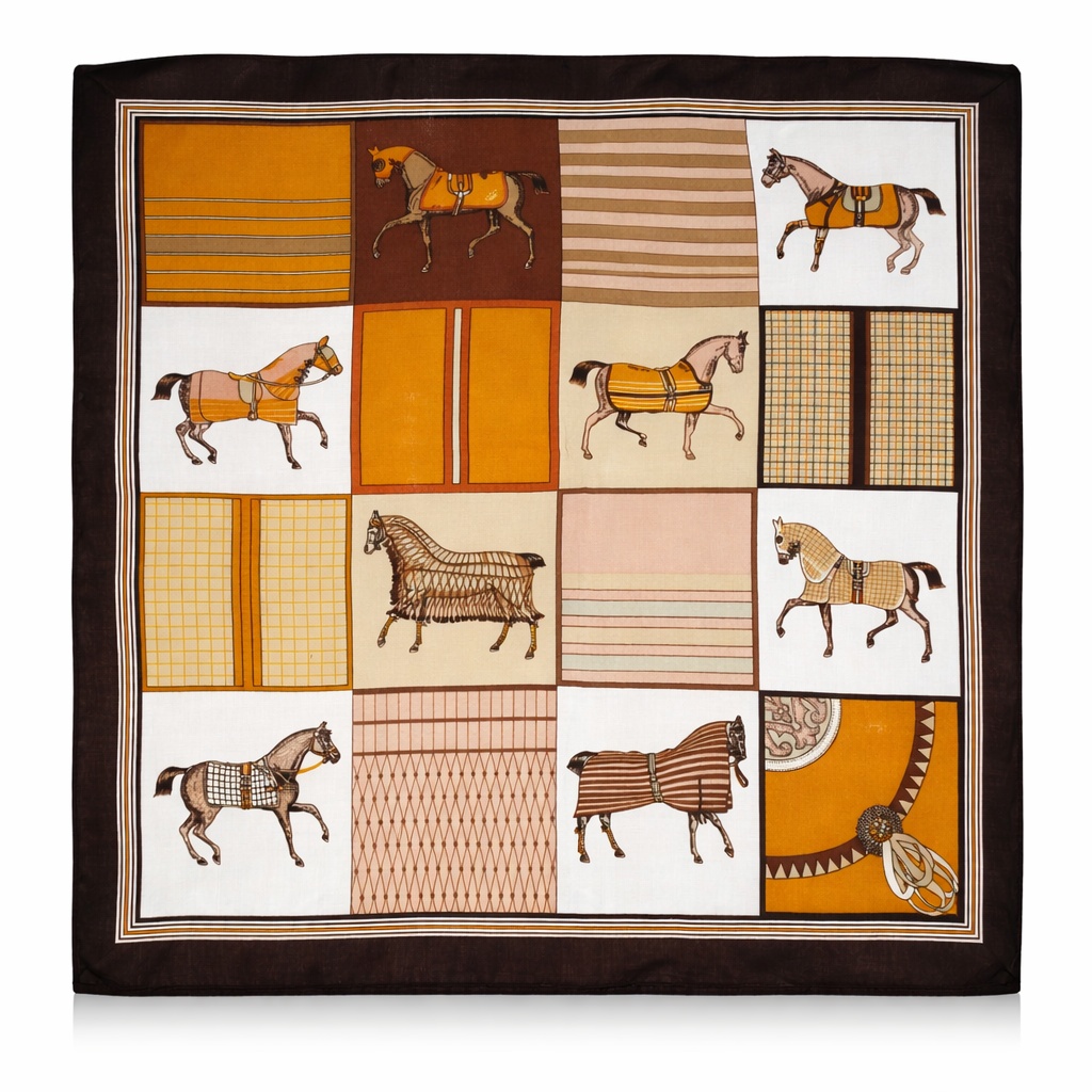 Стильный платок выполнен из гладкого, лёгкого материала с мягким шелковистым блеском и украшен выразительным геометрическим принтом с изображениями лошадей. Дизайн построен из аккуратных квадратных блоков с полосами, узорами и фигурными деталями в тёплых оттенках бежевого, горчичного, коричневого и белого, обрамлённых контрастной тёмной каймой. Платок красиво держит форму, легко драпируется и добавляет образу элегантный акцент с нотками классики и винтажного шарма. Идеально подойдёт для ношения на шее, в волосах или в качестве аксессуара на сумку, подчёркивая индивидуальный стиль и утончённый вкус.