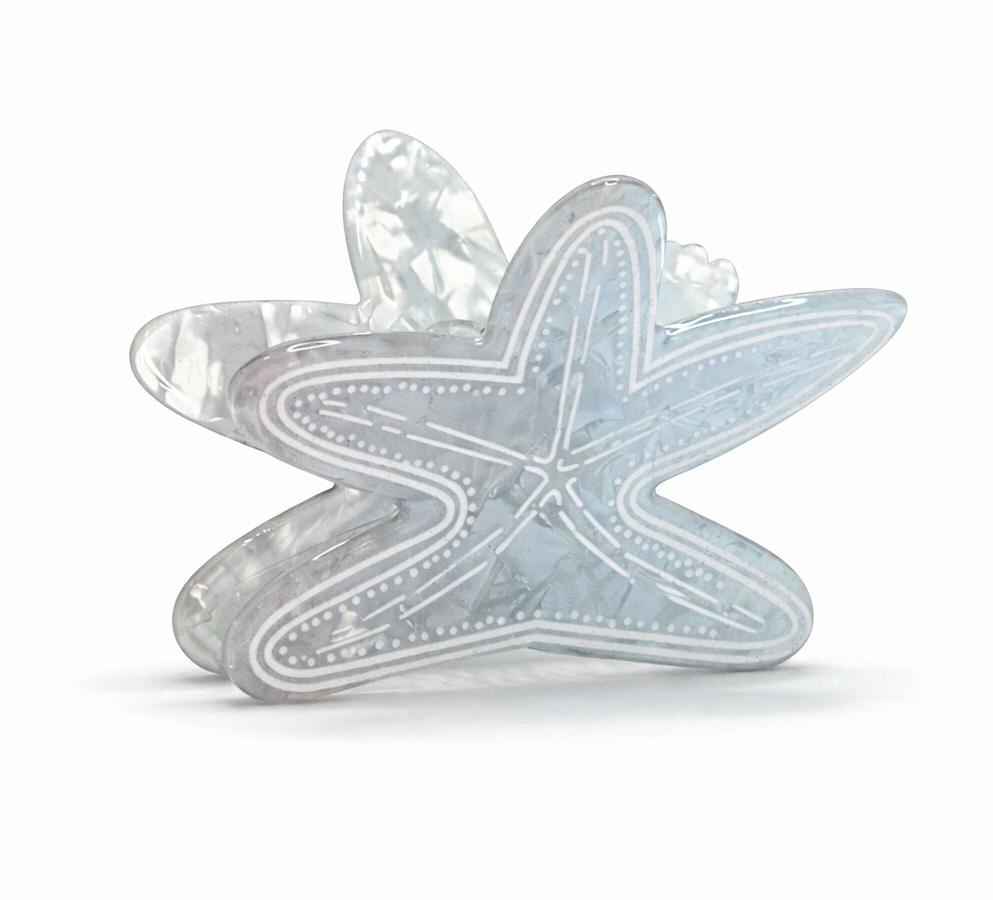 Эффектный крабик для волос в форме морской звезды — стильный аксессуар, который добавит образу свежесть и лёгкое морское настроение. Полупрозрачный голубой оттенок с мраморной текстурой и декоративным белым узором выглядит нежно, современно и привлекательно.
