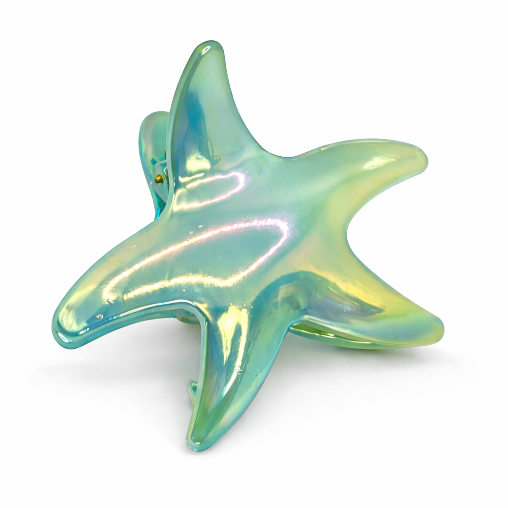 Эффектная заколка-краб в форме морской звезды с переливом зелёных и голубых оттенков — стильный аксессуар, который добавит образу свежести и лёгкого морского настроения. Глянцевая перламутровая поверхность красиво отражает свет и создаёт модный радужный эффект.
