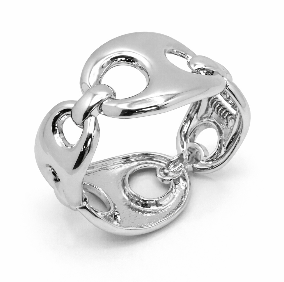 Яркий браслет-манжета с эффектными крупными звеньями — идеальный выбор для смелых и стильных образов. Необычная форма с плавными линиями и декоративными отверстиями придаёт украшению динамику и современный характер, а зеркальный серебристый блеск делает его заметным акцентом в любом луке.