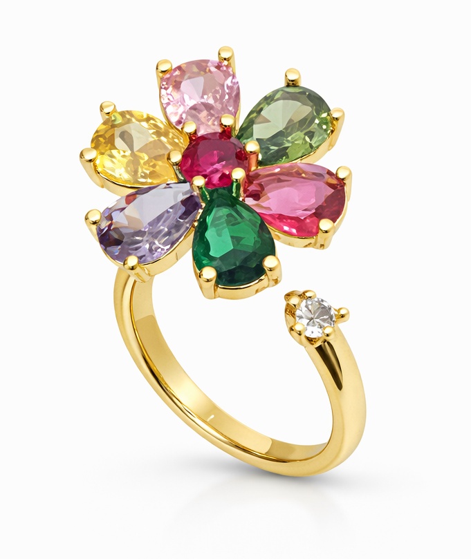 Яркое кольцо с декоративным цветком из разноцветных кристаллов — эффектное украшение, которое сразу привлекает внимание. Сочетание насыщенных оттенков и изящной формы делает модель идеальным акцентом для стильных и смелых образов. Лёгкий блеск камней и золотистая основа создают ощущение роскоши и праздника.