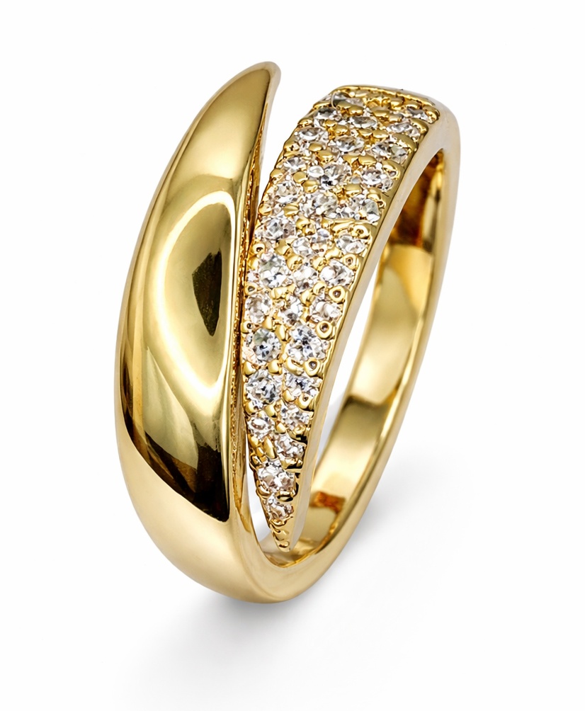 Роскошное кольцо с выразительным дизайном — идеальный выбор для создания утонченного и эффектного образа. Сочетание гладкой золотистой поверхности и дорожки из сверкающих кристаллов придает украшению глубину, блеск и современную элегантность.