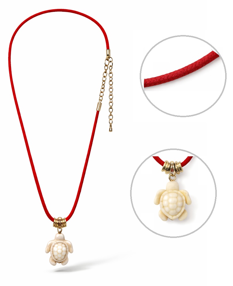Стильное колье с ярким акцентом — идеальный выбор для создания запоминающегося образа. Насыщенный красный шнурок дополнен подвеской в форме черепахи в нежном бежевом оттенке с золотистыми элементами, придавая украшению оригинальность и символичность.