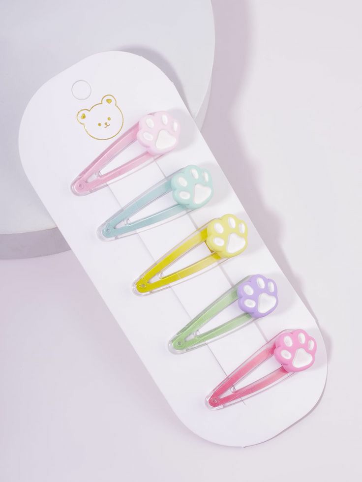 На фото представлен комплект из пяти заколок в форме классических клипс, каждая украшена объемной лапкой с белыми подушечками. Цвета — нежно-розовый, мятный, желтый, зеленый и сиреневый — создают радостное настроение и подчеркивают индивидуальность. Такие заколки отлично подойдут для повседневного использования, праздников или в качестве подарка.